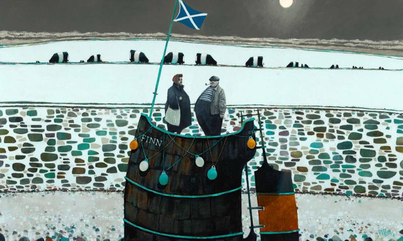 Gordon's subject matter ranges from quirky portraiture to emotive land and seascapes, and his deep love of the west coast of Scotland shines through in his evocative work. Gordon paints from the heart; his expressive oil paintings reflect the ever changing moods of both the countryside and the artist himself. His much loved paintings of old ladies (Biddies), Belted Galloway's and characterful Clyde 'puffers' allow him to create amusing narratives in his paintings.